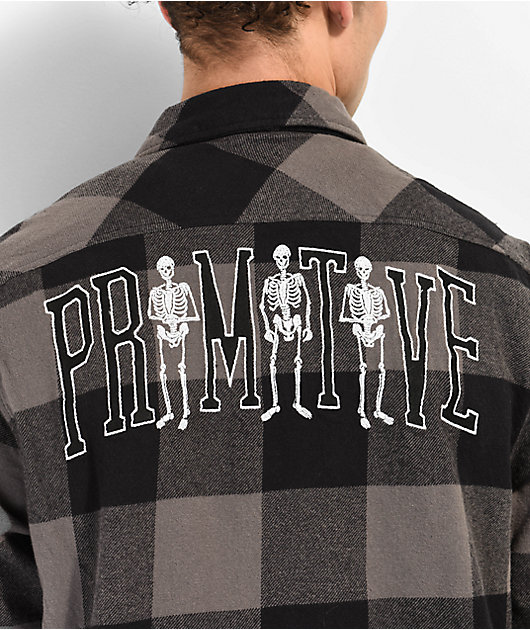 Made from soft cotton fabric, the Bygone flannel shirt from Primitive boasts a versatile black and grey plaid construction. Arched script is embroidered across the back for an eerie touch, while a full button closure and a turn down collar maintains a cla
