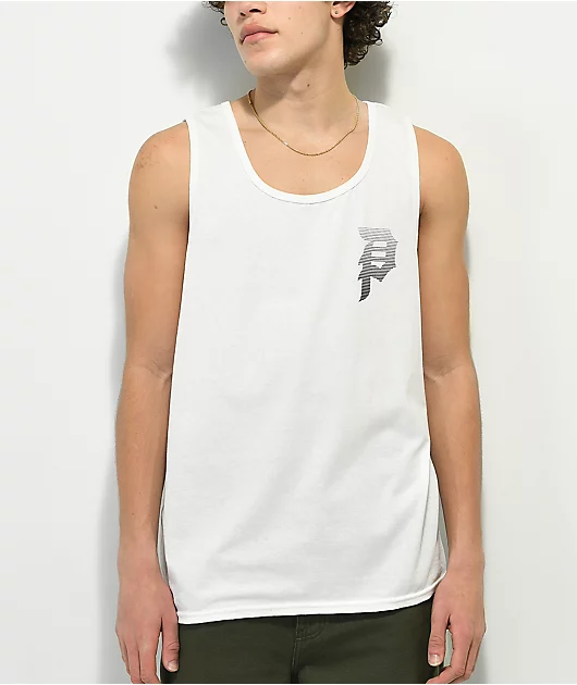 The Dirty P Bars Primitive tank top comes in a white colorway with screen-printed brand logos on the left side of the chest and on the back, and features a soft, 100% cotton construction with a scoop neckline and ribbed hems throughout.