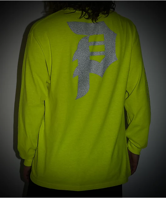 Lend a retina-searing element to your shirt rotation with Primitive’s Dirty P High Visibility neon yellow long sleeve t-shirt. This tee comes in a brilliant yellow-green colorway, with reflective silver graphics of Primitive’s Dirty P logo situated on its
