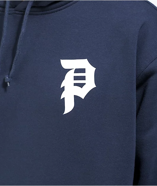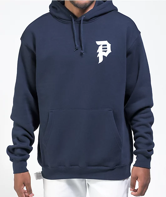 Simultaneously fresh and familiar, the Dirty P navy hoodie from Primitive is the perfect commemoration of your favorite skateboard brand! This hoodie features a huge Primitive Dirty P across the back in white, contrasting perfectly against the navy colorw
