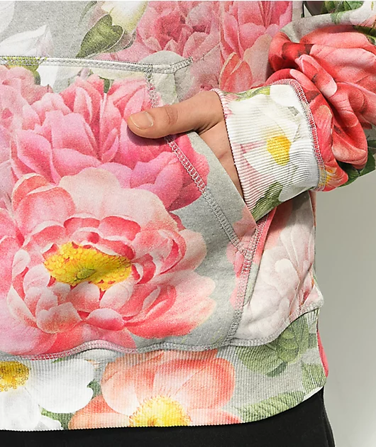 The Eden Primitive hoodie has a grey base colorway with colorful allover floral print, and is finished with a woven brand patch on the center of the chest. This Primitive pullover has a fixed hood, a kangaroo pouch pocket, and is made from a premium cotto