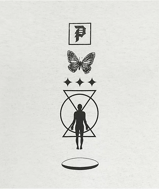 The Elevator Primitive t-shirt is made of 100% cotton and has a black colorway with a sleek graphic screen-printed on the front of the Dirty P logo, a butterfly, stars, a person, and a hole, all trailing down one after the other. On the back is a compleme