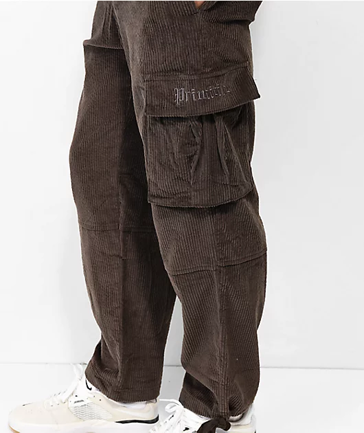 Primitive brings the Genesis cargo pants in a brown corduroy construction, offering storage space with dual slash hand pockets, dual welt seat pockets with button closures and dual cargo pockets on either thigh.