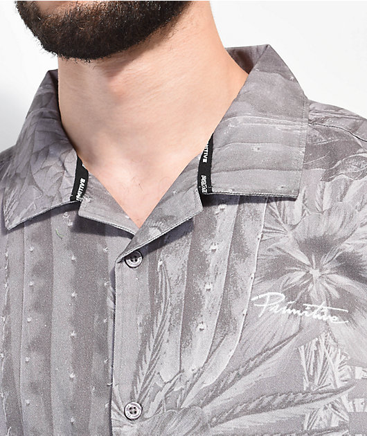 From Primitive comes the Highness natural button up t-shirt in a camo colorway. Sublimated images of Hawiian style print can be seen throughout, presented in drab colors that contradicts traditional Hawaiin style shirts. Left of chest is the brand name em