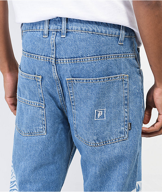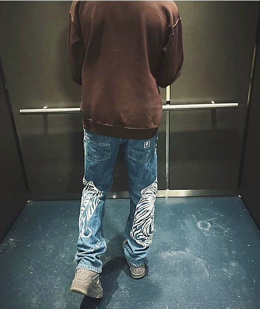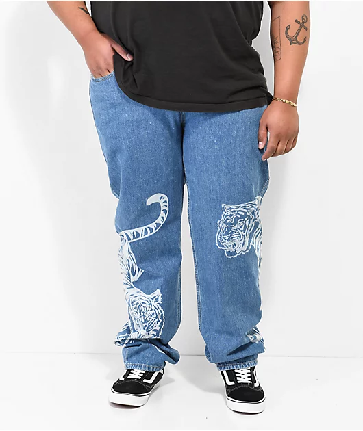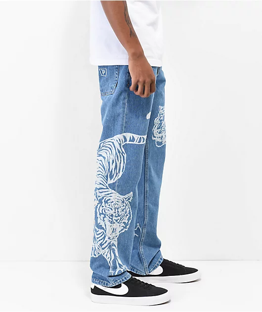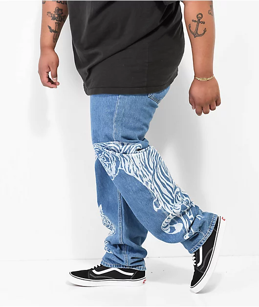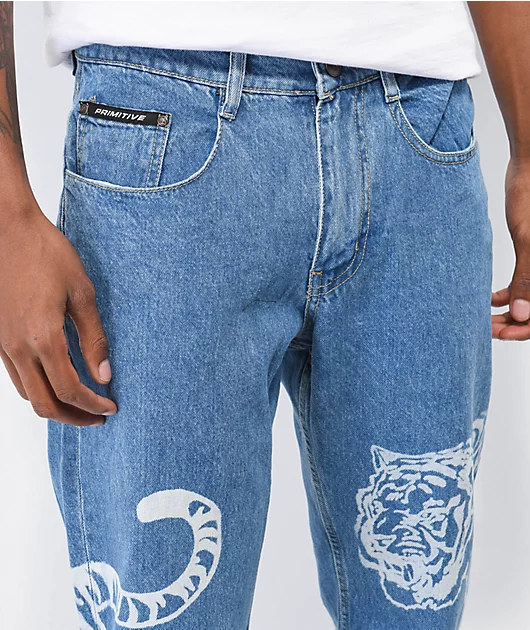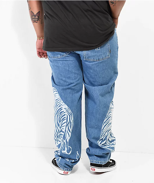 The Hunter Primitive jeans come in a blue denim construction with sublimated, white tiger graphics throughout. These comfortable, 100% cotton jeans have a classic button-and-fly closure with a five pocket construction and a loose fit.