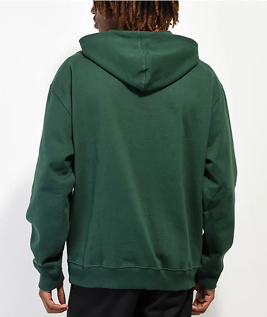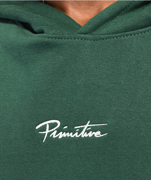 The Nuevo Core Premium hoodie from Primitive comes in a green colorway with brand script embroidered in white across the chest and a small brand tag on the left sleeve. This cotton-poly hoodie has a relaxed and loose fit that features a fixed hood and a k