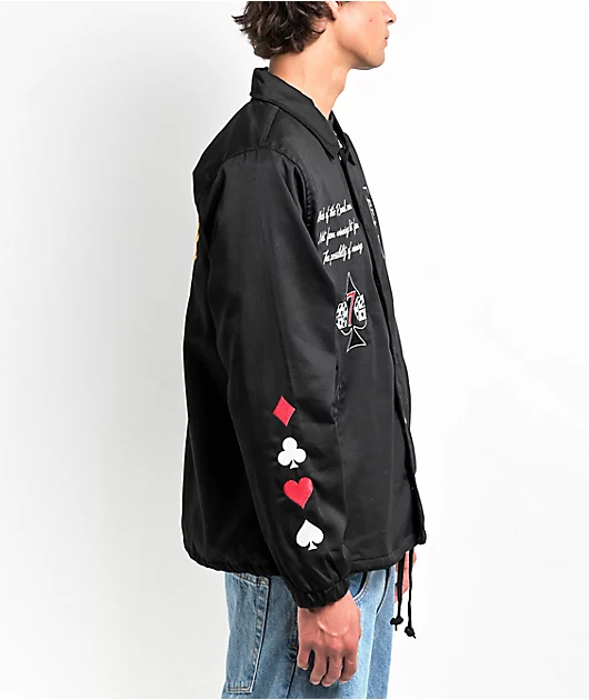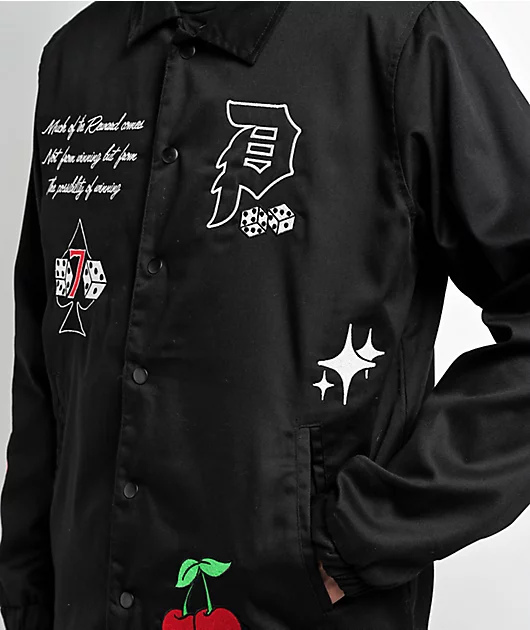 Made of 100% cotton, the Royal coaches jacket from Primitive comes in a black colorway with embroidered brand graphics throughout including dice and the Dirty P logo. This style offers a drawstring adjustable bottom hem and snap button closure with a clas