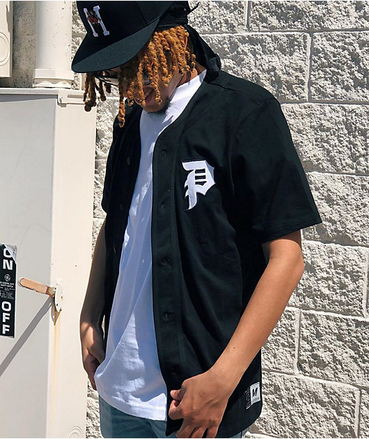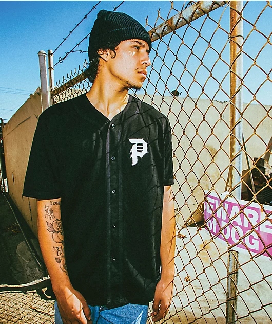 Knock your daily looks straight out of the park with the Primitive Tokyo Champion black baseball jersey. A full button-up closure and rounded bottom hemline give this jersey a classic baseball-inspired silhouette and the embroidered \”P\” on the left chest