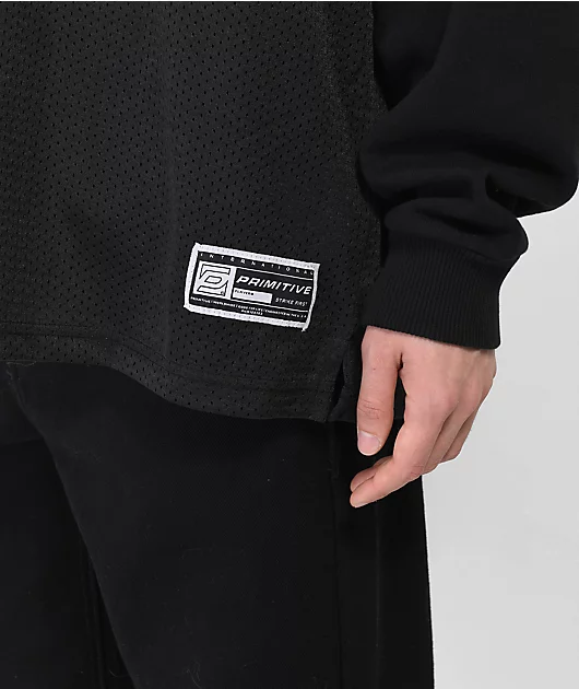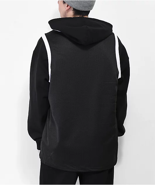 Primitive Skateboards introduces the twofer hooded basketball jersey in a black colorway. The top features a full black hoodie with a black and white mesh basketball jersey stitched on top, decorated with Primitive logo script embroidered across the chest