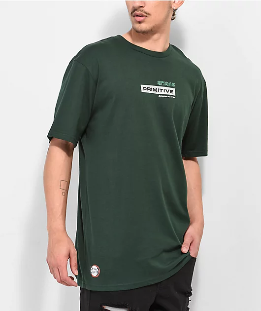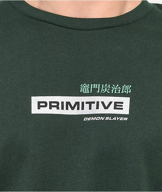 An official collaboration by Primitive x Demon Slayer brings the Tanjiro Dirty P t-shirt in a dark green colorway, featuring screen-printed logo & text on the left chest; complete with a large screen-printed graphic of Tanjiro standing proudly with his sw
