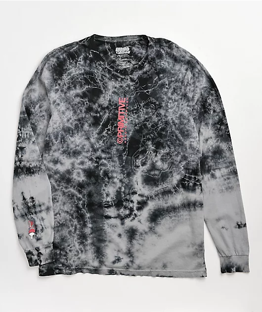 Keep your anime looks on point in epic style with the Primitive x Naruto II Obito washed black long sleeve t-shirt. This long sleeve features a dark black tie dye wash throughout for a textured look, while the logo graphics on the chest and back accompani