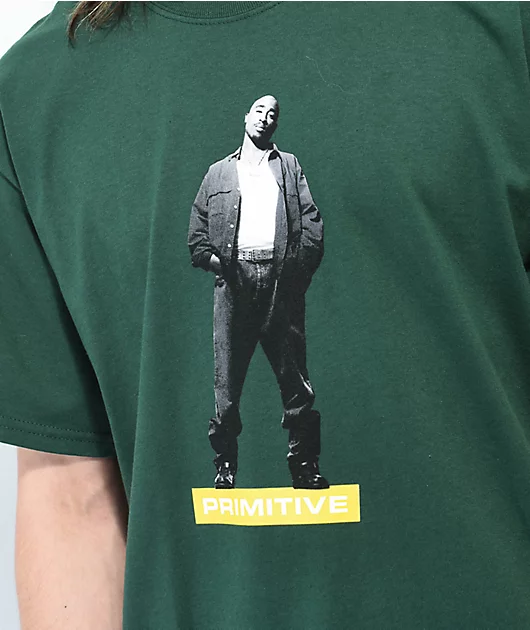 The Posted t-shirt from the Primitive x Tupac collaboration comes in a green colorway. A screen-printed graphic of Tupac Shakur is centered on the chest, above yellow Primitive branding. Made from 100% cotton, the t-shirt is finished with a ribbed collar