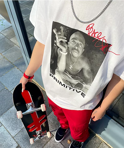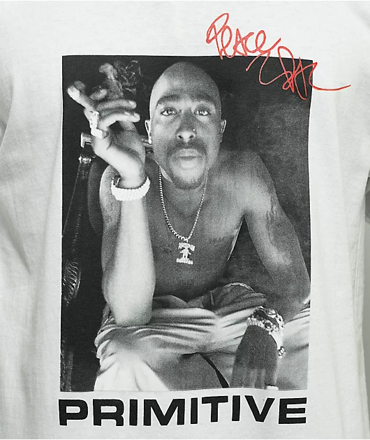 The Smoke t-shirt from Primitive x Tupac is made of 100% cotton and comes in a white colorway with a screen-printed graphic on the front of Tupac Shukar smoking a cigar.