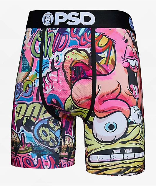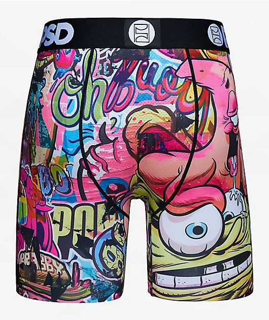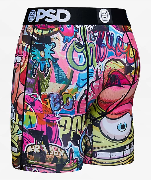 The PSD Bikini Bottom Chills boxer briefs feature sublimatted imagery of Spongebob, Patrick, and a variety of characters from the classic Nickelodeon cartoon. Made with a stretchy polyester blend, the PSD boxers boast flatlock stitched seams and are finis