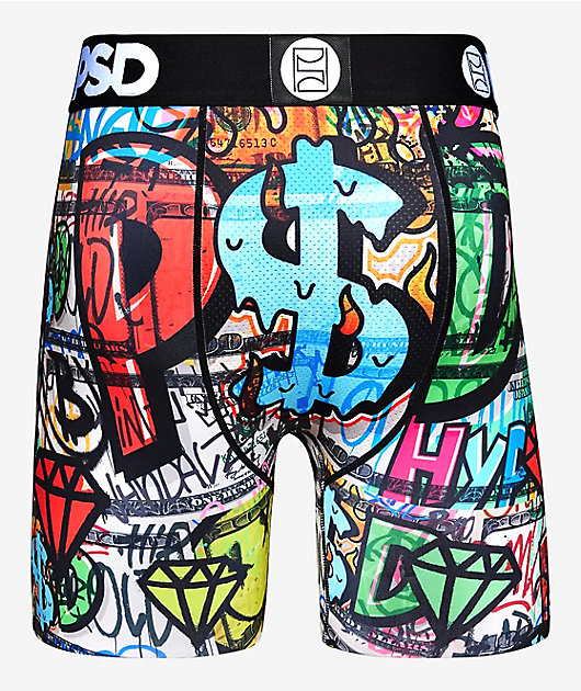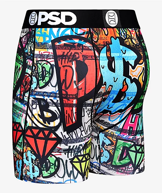The PSD Bills boxer briefs feature a colorful graffiti lettering, images of diamonds, and hundred dollar bills throughout. Made using soft microfiber fabric, the PSD boxers have a thick elastic waistband to ensure a comfortable fit.