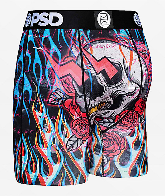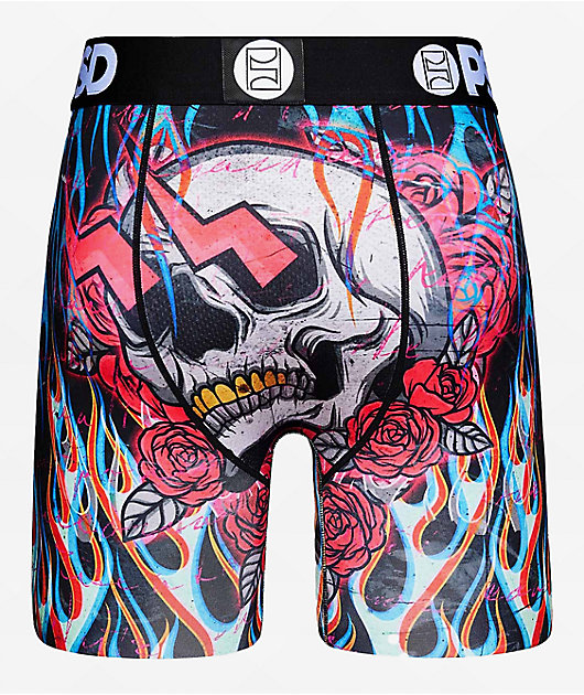 From PSD Underwear comes the Flames N Bones boxer briefs, featuring a graphic of a skull at the center with red lightning bolts coming out of the eyes, while blue flame print resides at the leg openings. The briefs are constructed from a blend of polyeste