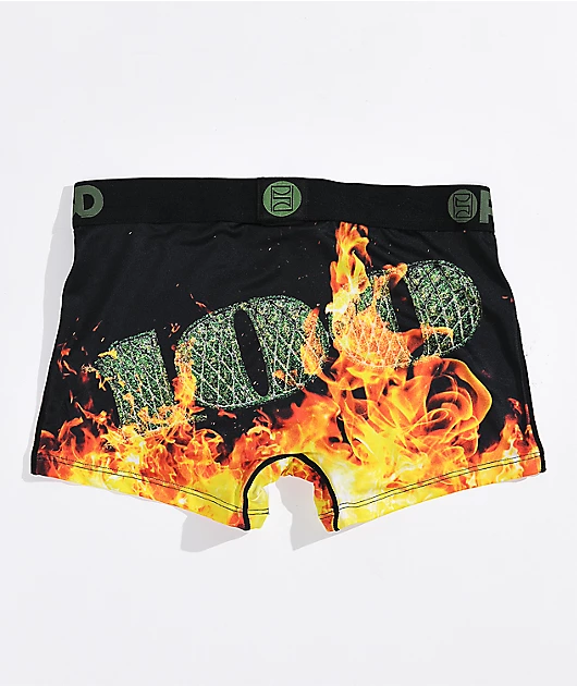 The Lit 100 boyshort underwear from PSD features a sublimated graphic of flames and a burning stack of money against a black background. The PSD boyshorts are features a stretchy, soft microfiber material that conforms to your body while the high profile
