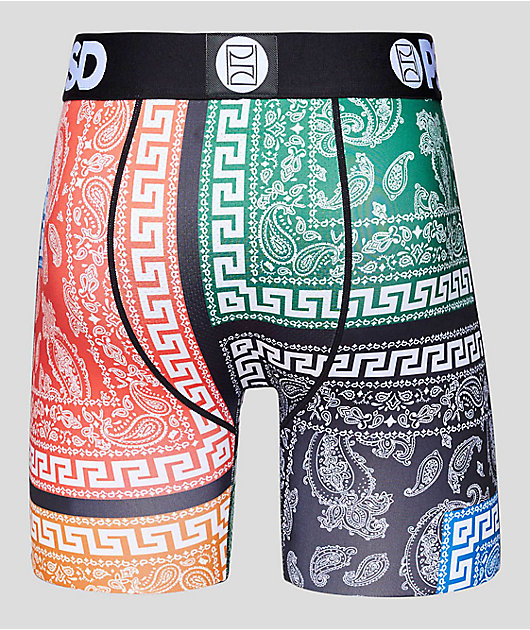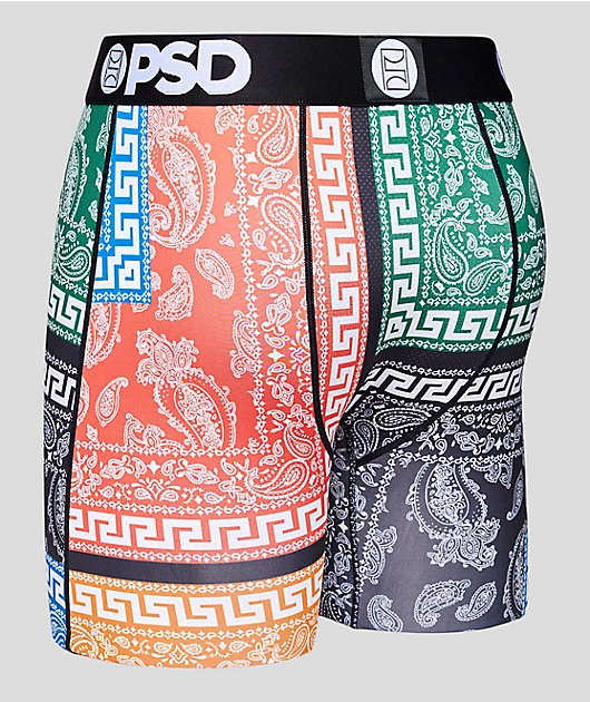 The Rich Meander Lux boxer briefs from PSD feature a black waistband adorned with the brand name and sublimated paisley bandanas in different colors throughout the legs. These comfy boxer briefs come equipped with a polyester and elastane blend that doesn