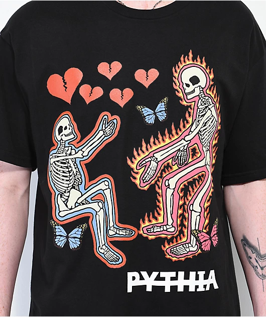 From Pythia comes the Skeleton Love t-shirt in a black color way, showing off a vibrant graphic of two skeletons, one surrounded by flames and the other outlined in red for contrast; while hearts and butterflies surround them. This short sleeve tee is con