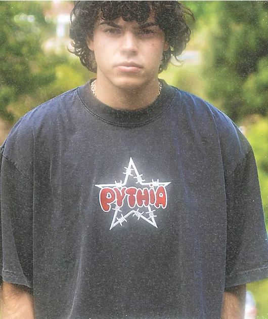 The Star t-shirt from Pythia x Shaka Wear is made of 100% cotton and comes in a black wash colorway, adorned on the front with a barbed wire star and red brand script embroidered across the chest.