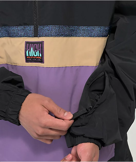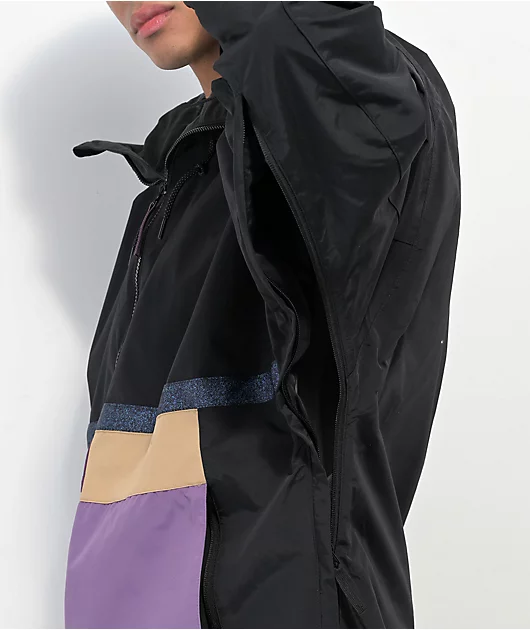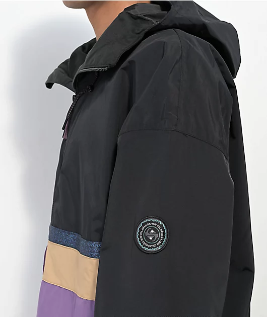 Quik Silver brings the Steeze snowboard jacket in a black colorway, offering a 90’s style with color blocking at the kangaroo pouch pocket in accents of beige, lavender and blue. This quality anorak jacket offers a snug fit with elastic sleeve cuffs and a