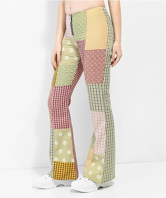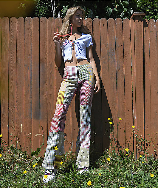 The Country flare pants from Ragged Priest is made of a polyester-viscose blend and features plaid patchwork throughout with a tight, high-waisted fit featuring a stylish flare leg. For secure closure, these pants have exposed zip-up closure on the front.