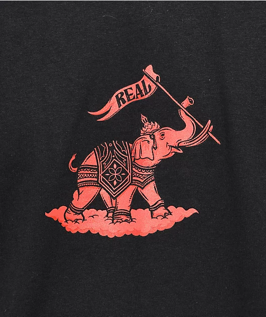 Constructed from midweight cotton and coming in a black colorway, The Elephant t-shirt from Real Skateboards features a screen-printed graphic at the back of a red elephant holding up a Real Skateboards flag with its trunk.