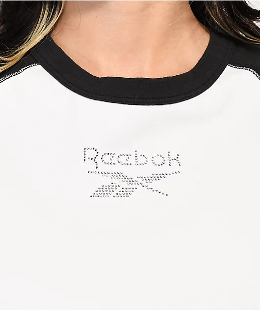 The Classics Sparkle Raglan t-shirt from Reebok comes in a crop construction with a white colorway and black sleeves. Across the chest of this 100% cotton t-shirt is the Reebok logo in silver rhinestones for a throwback look.