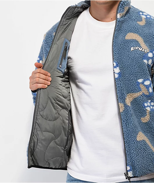 The Euphoria fleece jacket from RIPNDIP comes in a grey colorway on one side while the other side displays the woven images of mushrooms over a sky blue accent. This reversible coat is constructed of a durable polyester material, offering a cozy fit with