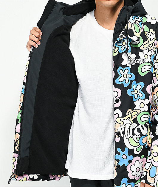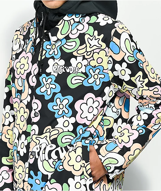 Layer up in colorful doodle style with the RIPNDIP Flower Child 10K snowboard jacket from RIPNDIP! Layered over a black colorway, this couch-style, 10k water-resistant snowboard jacket is adorned by a multitude of colorful, squiggly flowers throughout. Th
