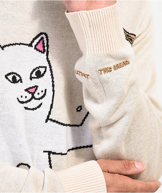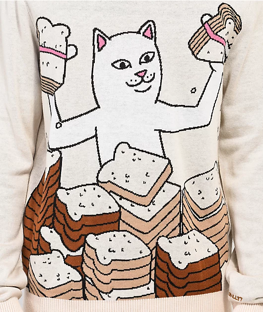 The Get Bread RIPNDIP sweater comes in a natural colorway with a jacquard knit graphic on the front of Lord Nermal surrounded by sliced bread and embroidered script on the left sleeve reading, \”Lets get this bread\” for inspiration on-the-go. This sweater