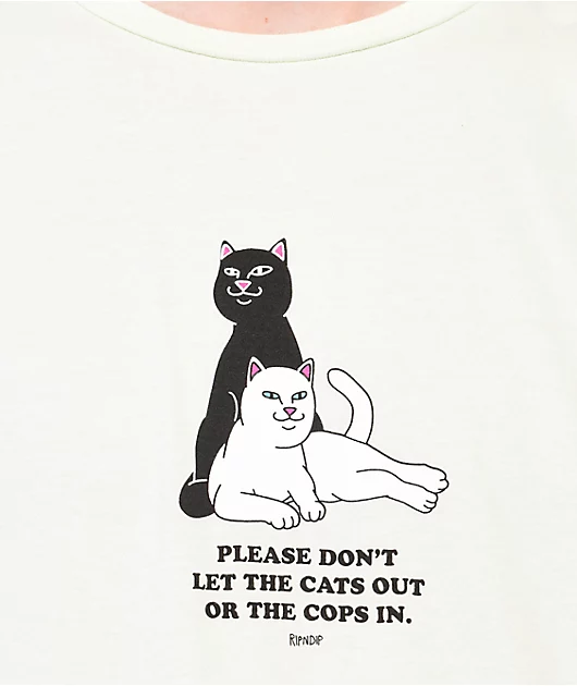 From RIPNDIP comes the Keep The Cats In t-shirt in a lime green colorway, with a graphic of black and white cats on the chest. Black text reading \”Please don’t let the cats out or the cops in.\” sits below, as the ultra soft cotton tee is finished with a r