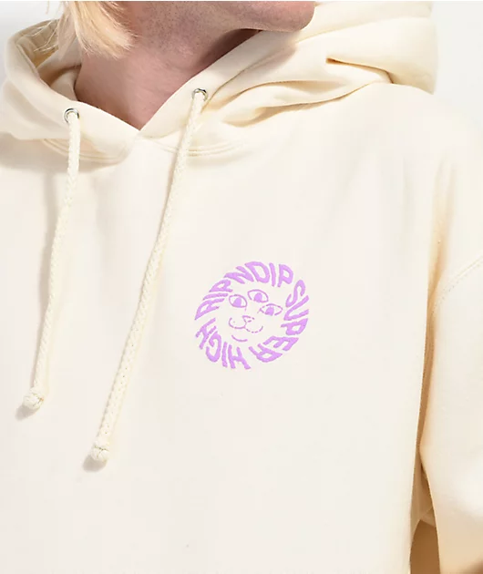 In a bone white colorway comes the Kinetic Field hoodie from RIPNDIP, showing off the brand name with Lord Nermal’s face left of chest and on the back on a larger scale. This hoodie comes with a kangaroo pouch pocket for on hand good, offering a snug fit