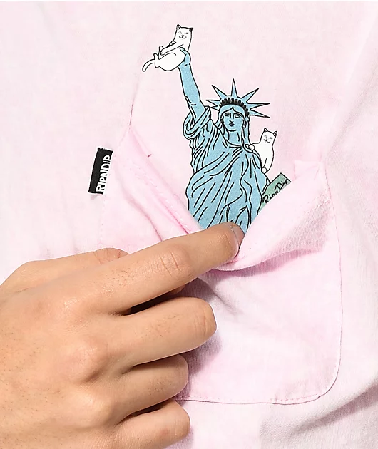 Liberty Nermal Pink T-Shirt from RIPNDIP. A white cat, Lord Nermal, has been elected as our nation’s leader, and his presidential portrait features two of him, being held by the Statue of Nerm, (formally Statue of Liberty). Show off your pur-pride and sup