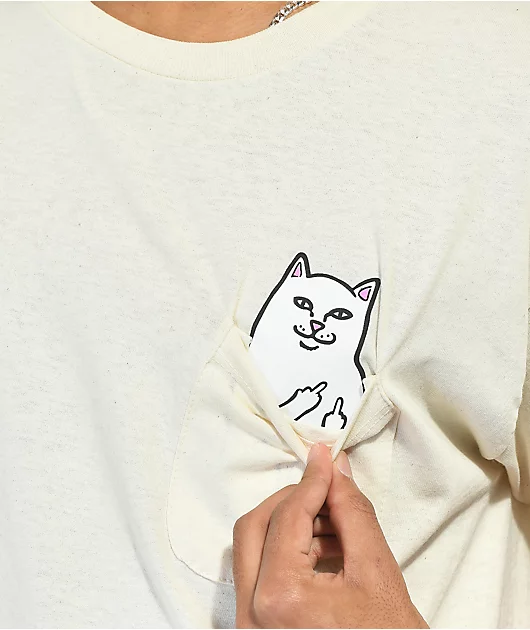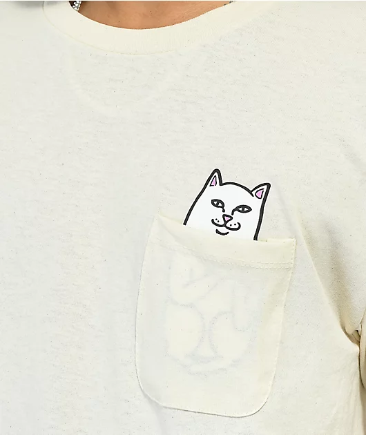 The Lord Nermal RIPNDIP t-shirt is featured in a sand colorway with a Lord Nermal graphic peeking from the left chest pocket. This RIPNDIP shirt is made from lightweight, durable cotton, and has a crewneck collar and short sleeve silhouette that makes it