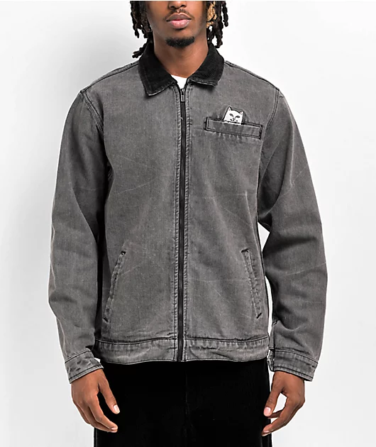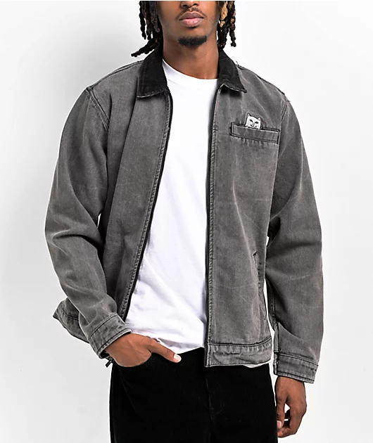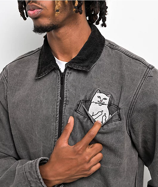 The Los Feliz work jacket from RIPNDIP comes in a black denim construction with a corduroy collar for added depth and full zip closure ensuring a secure fit. This style offers embroidered graphics throughout including Lord Nermal poking out of the left ch