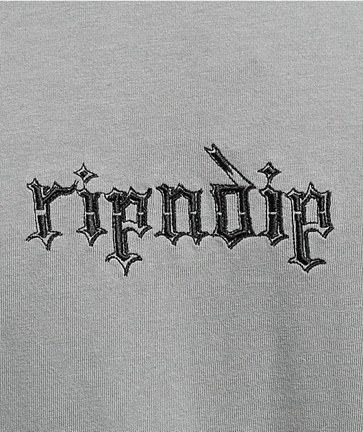 The Los Feliz t-shirt from RIPNDIP is made of 100% cotton and comes in a grey colorway with black, embroidered brand script across the chest in an Old English font.