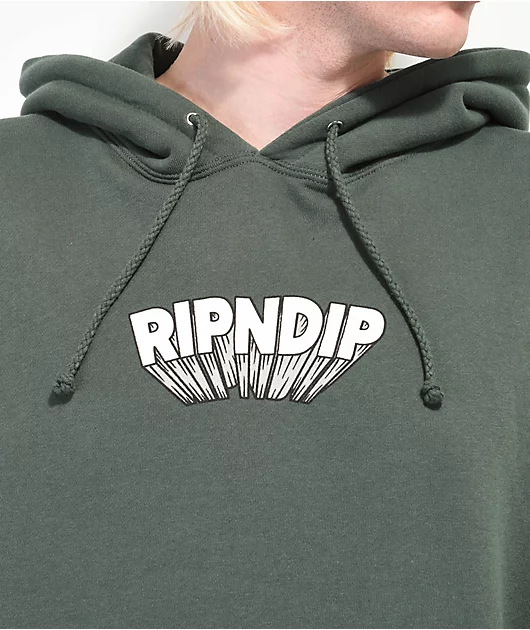 The Mind Blown hoodie from RIPNDIP comes in a green colorway, made from a heavyweight cotton construction. The chest features cartoon-style brand text in white, while a larger image of Lord Nermal with