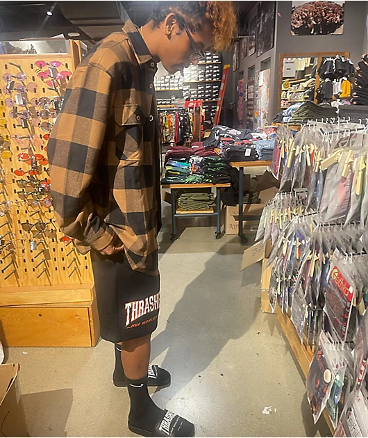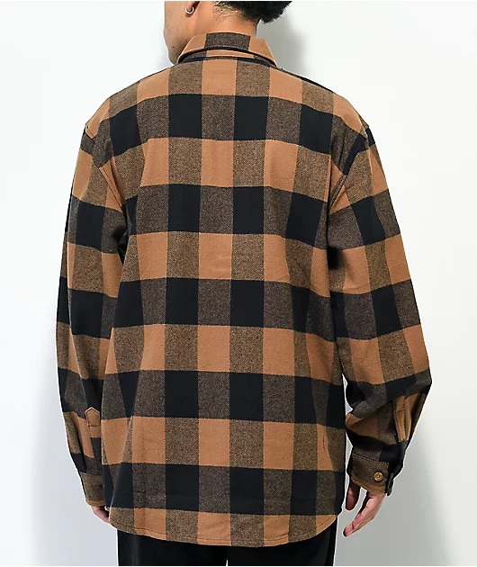 This warm Rothco flannel shirt has an extra heavy cotton construction and a thick brown and black plaid pattern. This Rothco shacket has a full button-up closure, a turndown collar, dual chest pockets with a button and flap closure, and is finished off wi