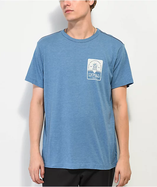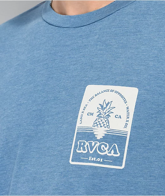 The Landsee RVCA t-shirt is made of a soft cotton-poly blend and comes in a vintage blue colorway with a pineapple brand logo on the left of chest and script reading, \”Balance of opposites | Land x sea\” on the back.