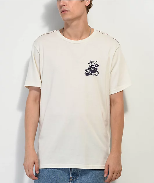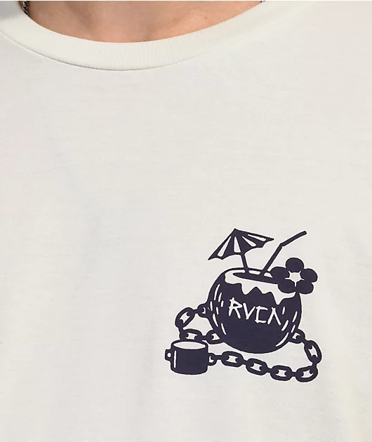 The Locked Down RVCA graphic tee shirt comes in an off-white colorway and is made from soft cotton for a comfortable and casual fit. The left chest sports a RVCA logo graphic of a coconut beverage with a chain, while the back features the same RVCA graphi