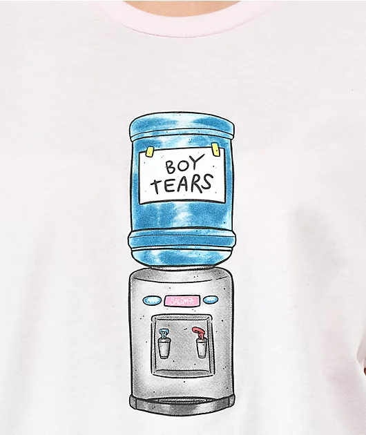 The Boy Tears Salem7 t-shirt is made of 100% cotton and comes in a pink colorway with a screen-printed graphic on the front boasting a water dispenser with a piece of paper over the jug reading, \”Boy tears.\”