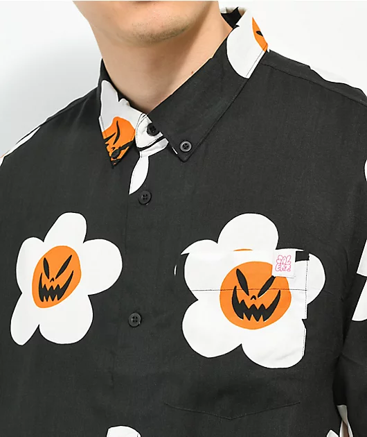 The Ghoulfriend black short sleeve button up shirt from Salem7 is constructed from an ultra-soft and lightweight rayon material with a traditional woven shirt silhouette and a full-button closure for easy layering. Appearing throughout the shirt is an all