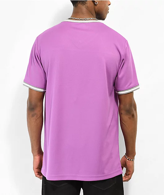 In a purple colorway comes this baseball jersey from Salem7, showing off the brand name embroidered across the chest in a black that stands out and reflective grey material that catches the light. This jersey offers breathabiility with a mesh construction