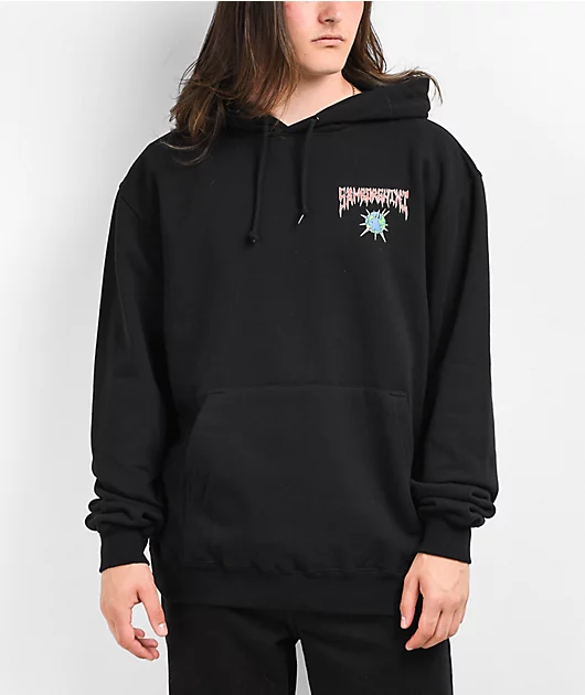 The Devil’s Playground hoodie from Samborghini comes in a black pullover construction with a drawstring-adjustable hood and a kangaroo pouch pocket for easy on hand access. This style is adorned on the left of chest with edgy red script and a spiked globe