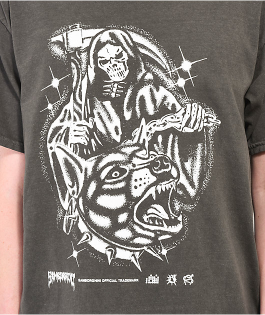 The Dog Reaper Samborghini t-shirt is made of 100% cotton and comes in a black wash colorway with a screen-printed front graphic of a reaper figure holding onto a leashed dog.