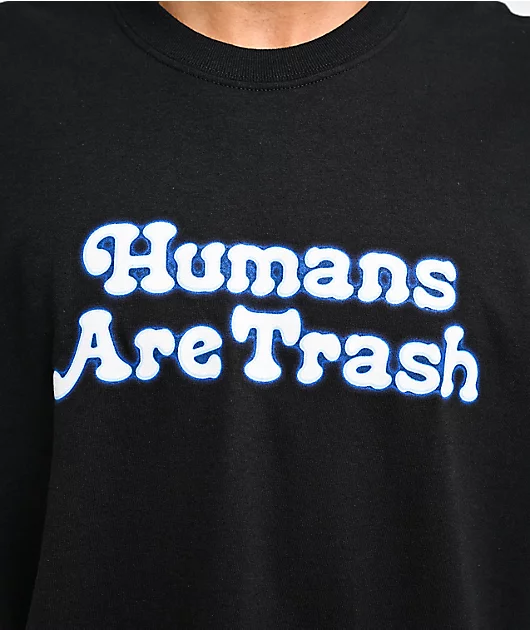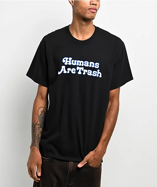 Created by PNW artist Samborghini, the Humans Are Trash t-shirt arrives in a black cotton construction with printed graphics on the front and back. Expressing the pessimistic phrase in bubbly lettering on the front, the back of the 100% cotton short