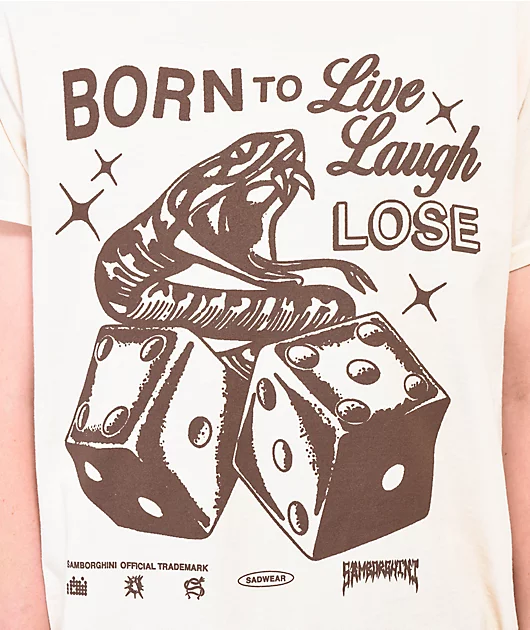 The Live Laugh Lose t-shirt from Samborghini comes in a tan colorway, with elegant brown screen-printed graphics on the front. Imagery with dice and a snake can be seen below text reading: \”Born to live laugh lose.\” Made from breathable midweight cotton,