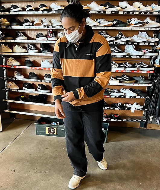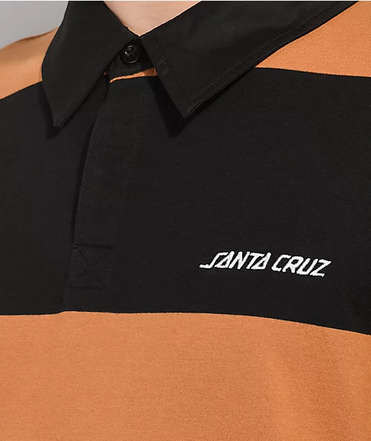 From Santa Cruz comes the Irwin long sleeve rugby shirt, with a unique black and sand striped construction. The durable cotton long sleeve has a black turn-down collar, paired with a traditional 3-button configuration. With white Santa Cruz embroidery on