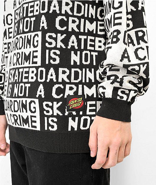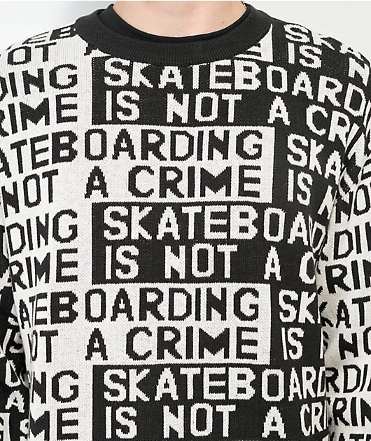 The Not A Crime t-shirt features maximalist design with black and white text thoughout reading \”skateboarding is not a crime.\” Made from soft 100% cotton, the delicately knit sweater features an allover jacquard-knit print, while ribbed accents along the